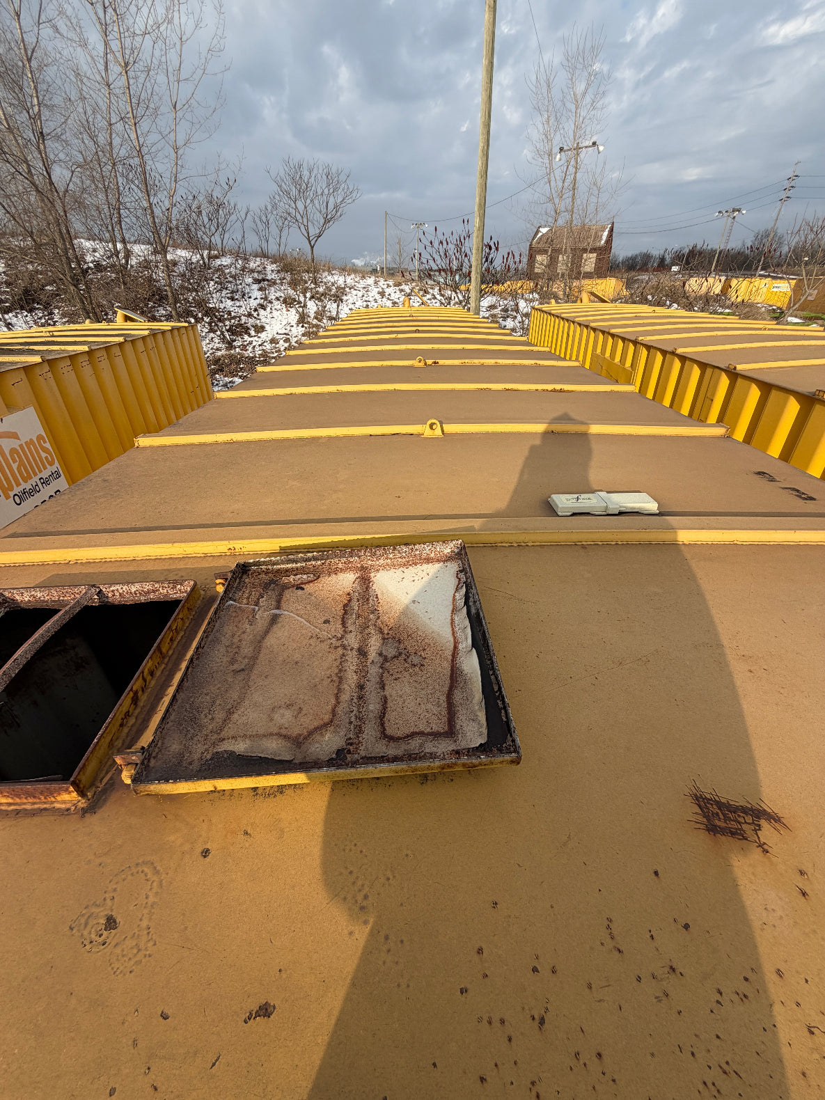 Please note that you as Purchaser are responsible for providing equipment, at delivery, to lift the frac tank(s) off the transport semi-tractor, the tongue weight is approximately 8,000 pounds.  As an alternative, you can use wooden blocks to temporarily block up the tank so that the tractor can disengage from the frac tank and drive away; if so, place the blocks under the rails about 15 feet back from the front of the tank where the blocks should be about 30 inches from the rail to the ground.