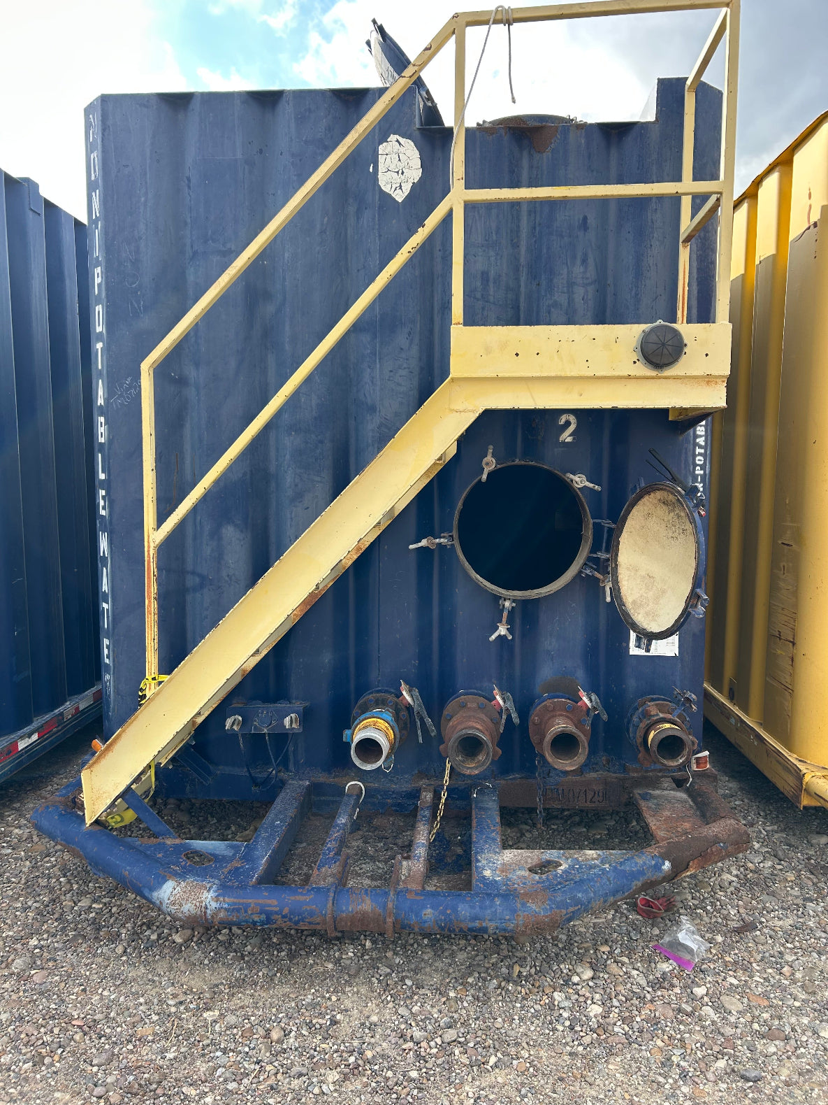 Please note that you as Purchaser are responsible for providing equipment, at delivery, to lift the frac tank(s) off the transport semi-tractor, the tongue weight is approximately 8,000 pounds. As an alternative, you can use wooden blocks to temporarily block up the tank so that the tractor can disengage from the frac tank and drive away; if so, place the blocks under the rails about 15 feet back from the front of the tank where the blocks should be about 30 inches from the rail to the ground.
